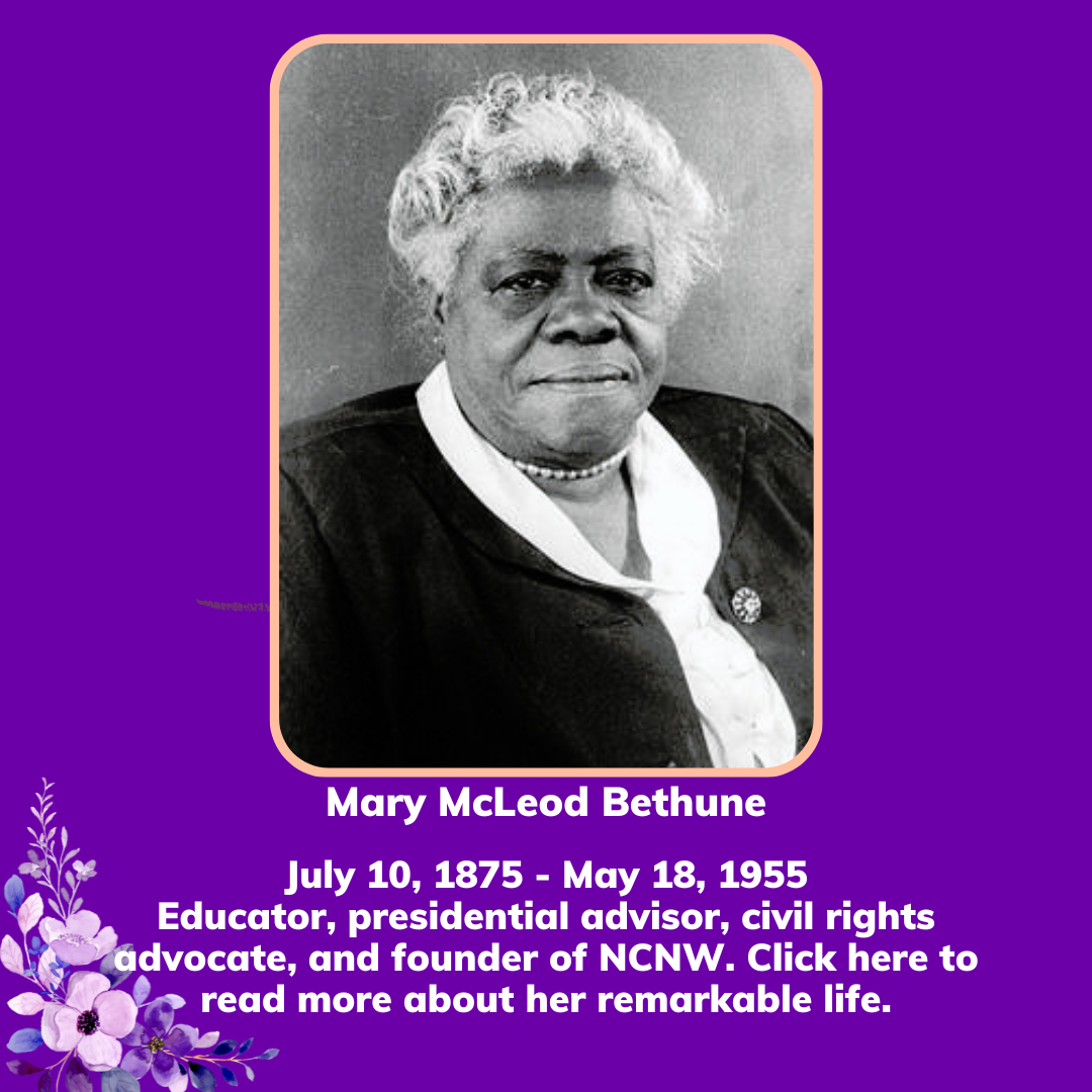 Honoring past national leaders of NCNW The mission of NCNW is to lead, advocate for and empower women of African descent, their families and communities. ~~ The mission of NCNW is to lead, advocate for and empower women of African descent, their families and communities. ~~ The mission of NCNW is to lead, advocate for and empower women of African descent, their families and communities. ~~ Click images to learn more about Dr. Bethune and Dr. Height